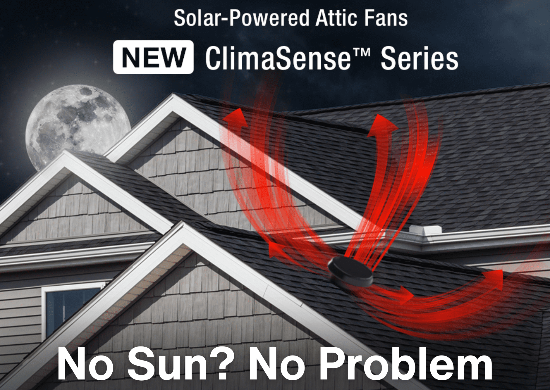 The ClimaSense™ Series Solar-Powered Attic and Garage Fans are engineered with integrated sensors that detect temperature and humidity changes, automatically activating the fan to maintain desired conditions. During the day, the fan is powered by the sun's free daylight. At dusk, it seamlessly switches to house power and continues running for four hours into the night.