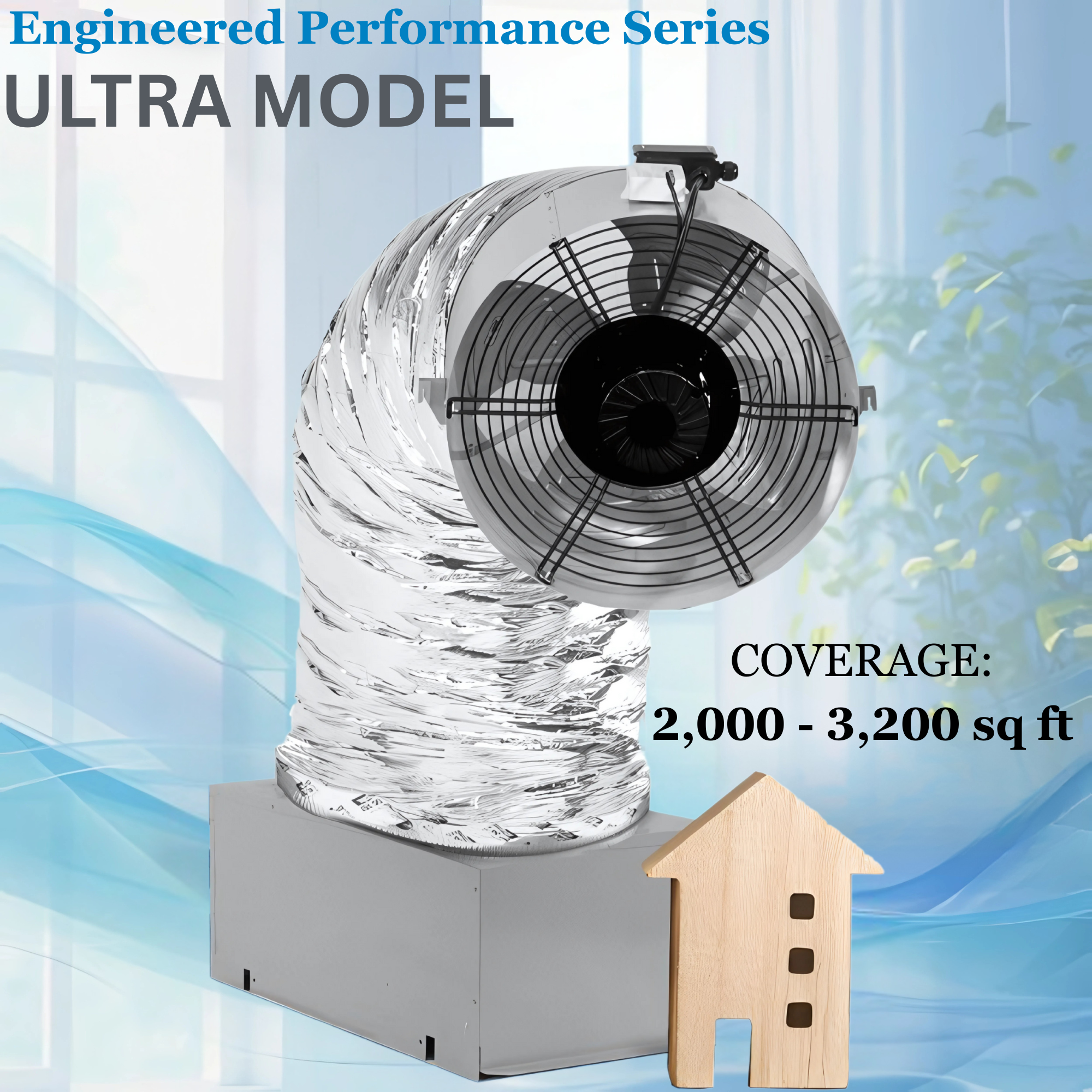 For larger homes and extreme heat, the EPS Ultra Model delivers the power, efficiency, and quiet comfort you need. Designed for homes between 2,000 and 3,200 square feet, this fan moves massive volumes of air to cool your entire home quickly — while saving you a huge amount on cooling costs. Featuring a precision-engineered 7-speed Electronically Commutated (EC) motor with advanced Soft Start Technology, it ramps up smoothly for a quieter, more refined operation that extends motor life. The patented HushMount 2 design further reduces vibration and sound, making the Ultra one of the quietest high-performance fans available. With its durable construction, whisper-quiet operation, and unmatched power, the EPS Ultra is built to keep even the largest homes cool, comfortable, and energy-efficient — no matter how intense the heat.